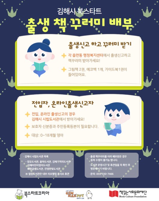 김해시 출생 책꾸러미 배부는 김해시에 주민등록을 둔 신생아를 대상으로 그림책, 육아 도서 등으로 구성된 독서 꾸러미를 무료로 제공하는 서비스입니다. 신청은 도서관 또는 행정복지센터에서 가능하며, 온라인 신청 후 방문 수령도 가능합니다.