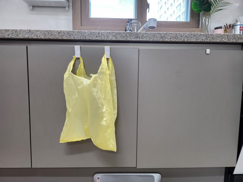 아무 봉투에 넣어서 씽크대 문에 걸어둔다.재사용하는 봉투가 조금은 너저분해 보이지만 외출할때 이 봉투만 쏙 들고 나가서 버릴 수 있다. 집에서 나오는 일반쓰레기를 제외한 재활용품은 이 봉투에 들어간다. 예전에는 세탁실 발코니 공간에 쓰레기통을 두었다.