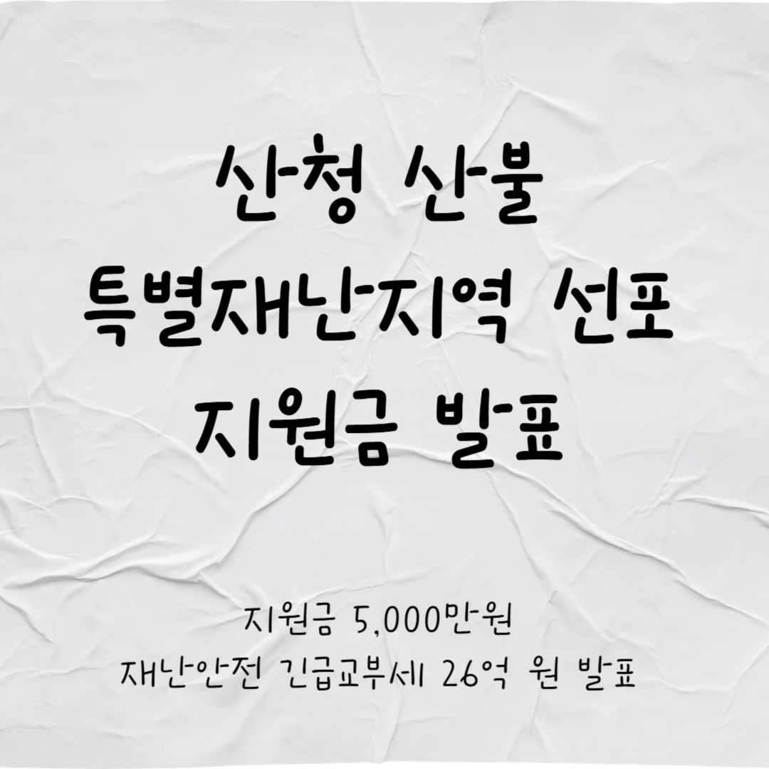 정부는 대형 산불로 피해를 입은 경남 산청군을 특별재난지역으로 선포하고, 울산·경북·경남 3개 시·도에 재난안전 긴급교부세 26억 원을 지원하기로 했습니다. 특별재난지역으로 지정되면 행정적·재정적·의료적 지원이 국가 차원에서 제공되며, 피해자는 생활안정지원금, 지방세 납부 보조금, 공공요금 감면 혜택을 받을 수 있습니다. 또한, 정부는 재난 사태를 선포하여 인력·장비 동원, 위험지역 설정, 대피 명령 등의 조치를 강화할 계획이라고 합니다.