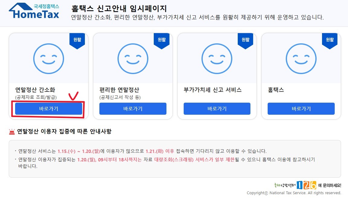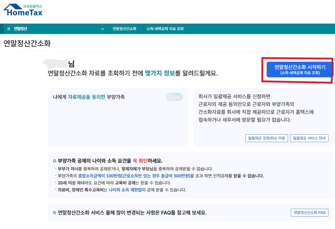 우측의 파란색 '연말정산간소화 시작하기' 버튼을 클릭합니다.