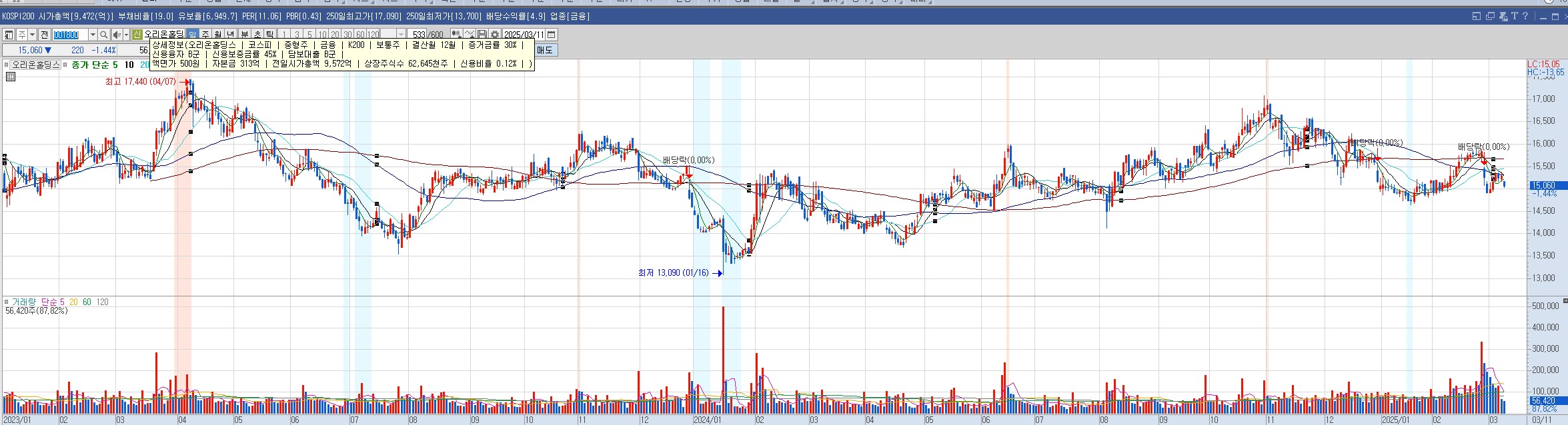 오리온 홀딩스의 배당수익률은 5.14%(23년 12월 기준)였습니다.